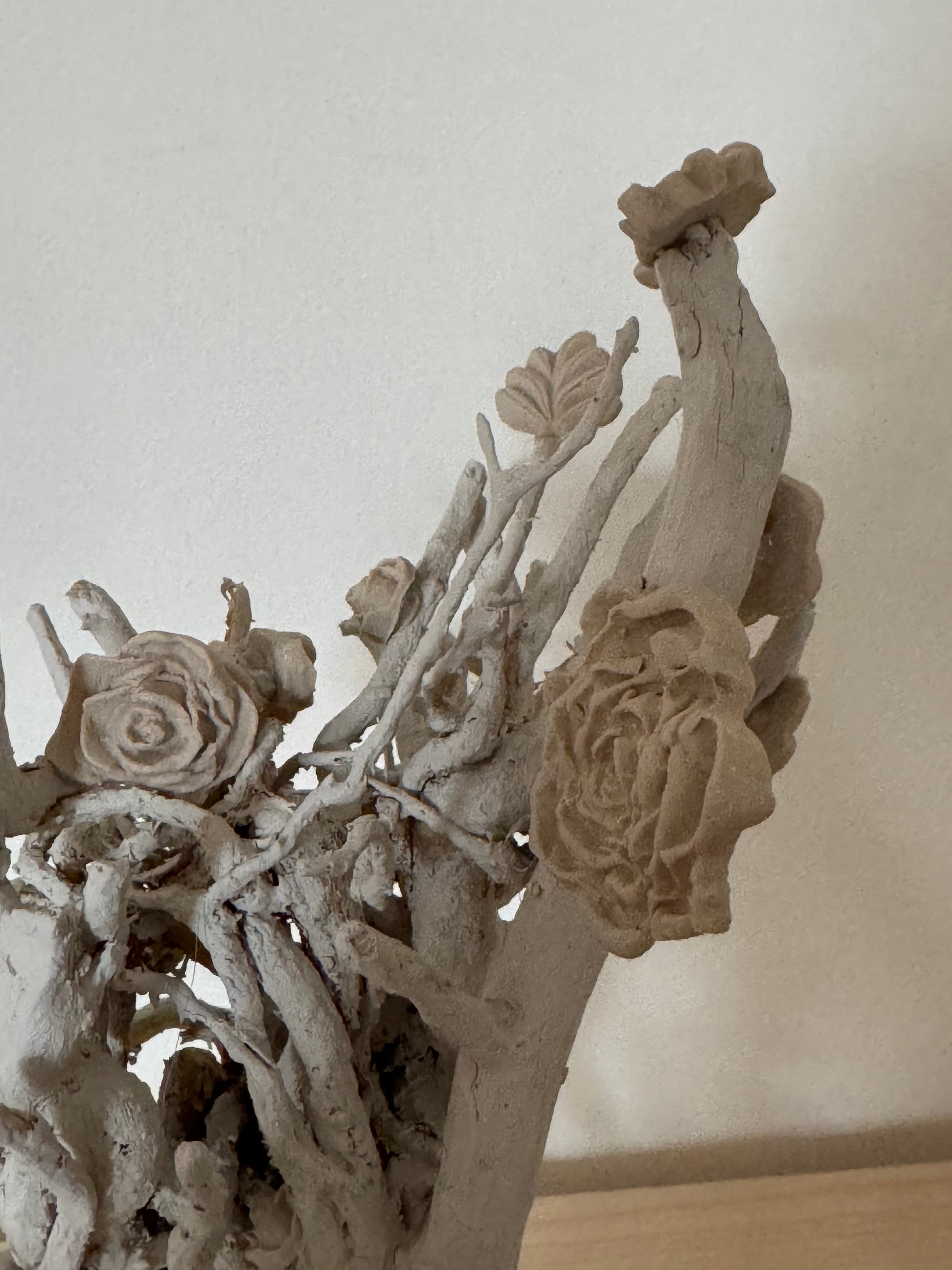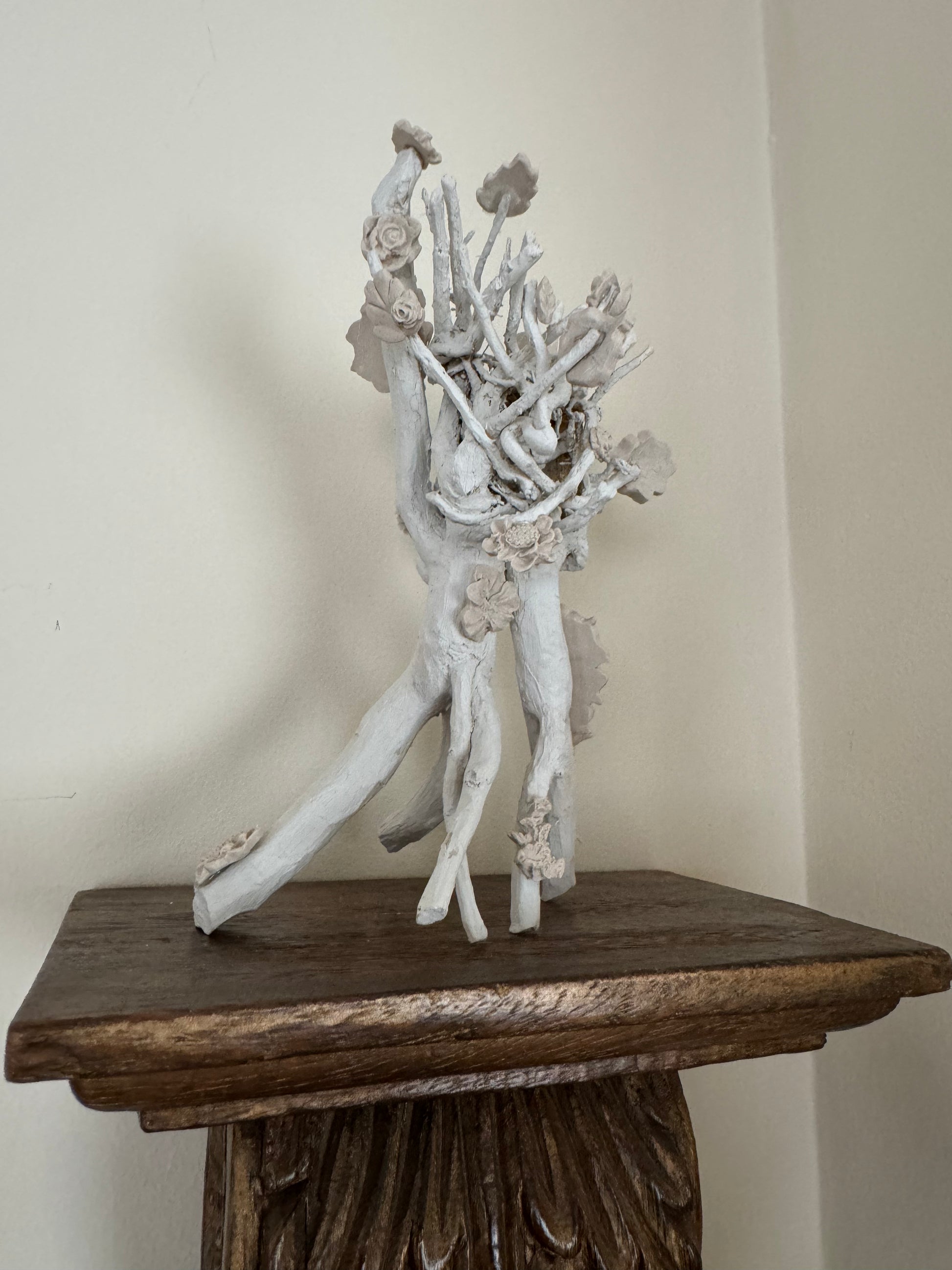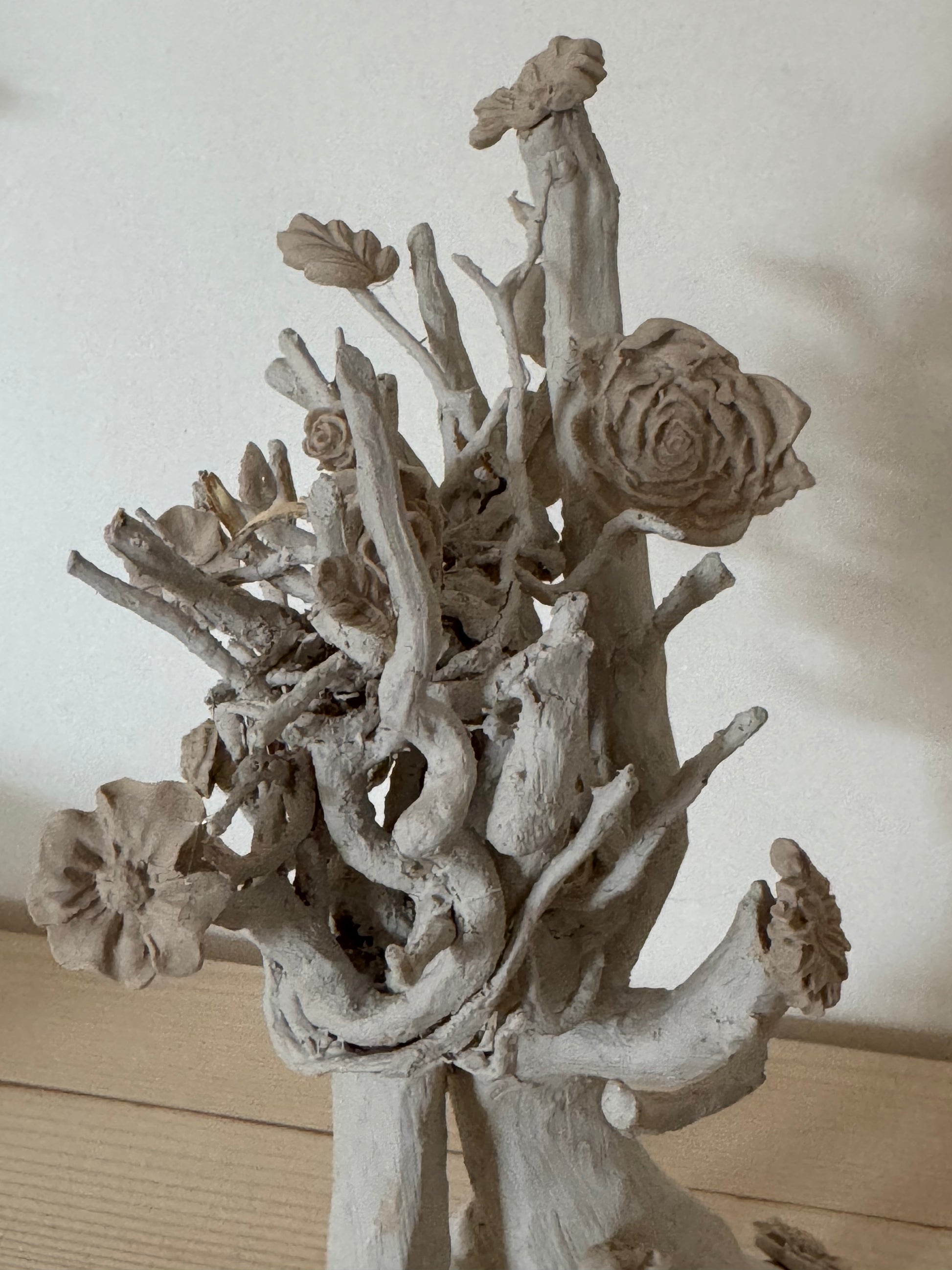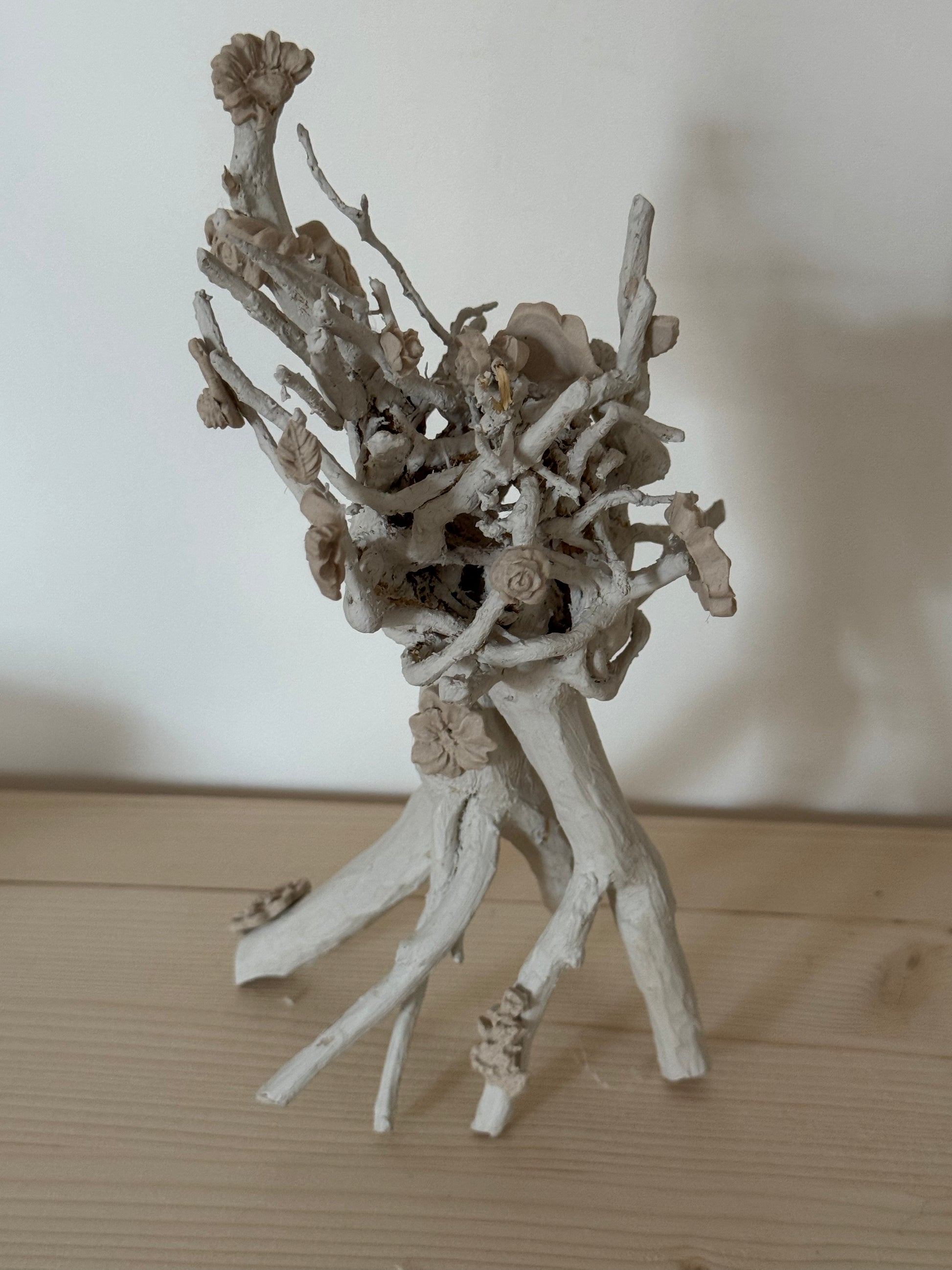 Painted lavender tree root adorned with unglazed stoneware leaves and flowers